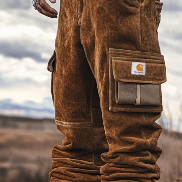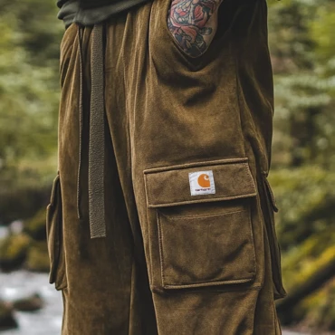 Men's Vintage Outdoor Multi-pocket Chic Drawstring Brown Suede Cargo Pants Joggers